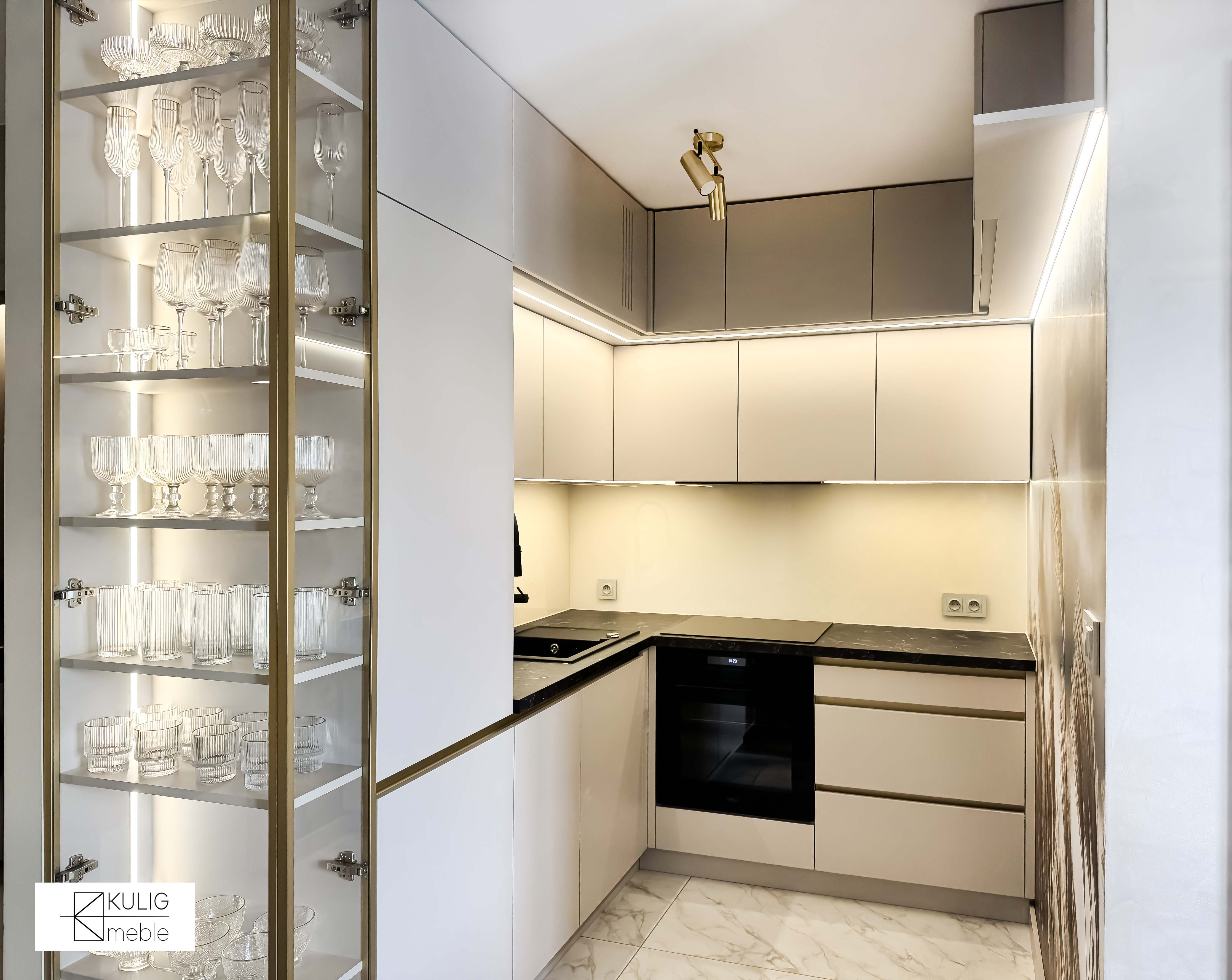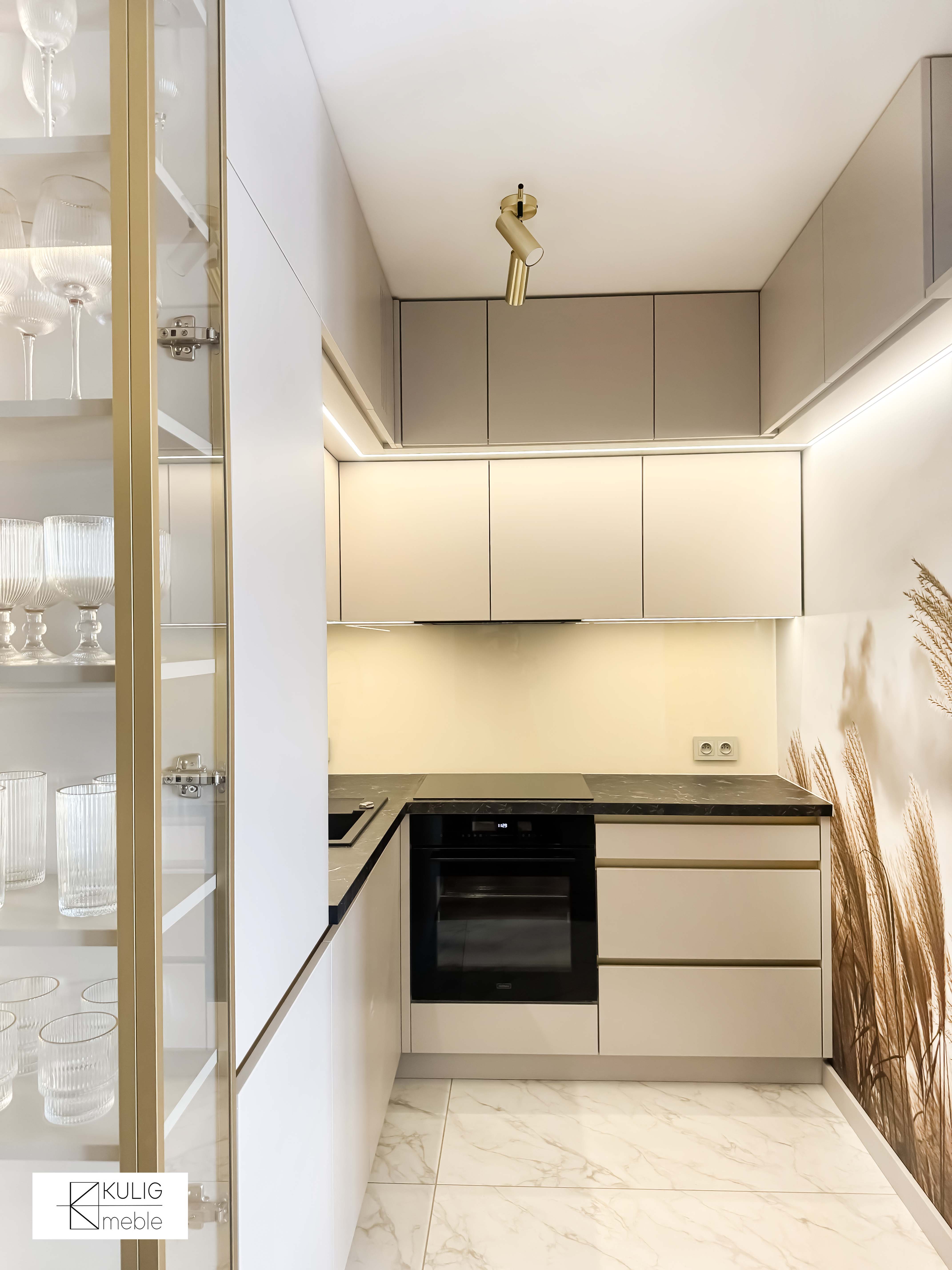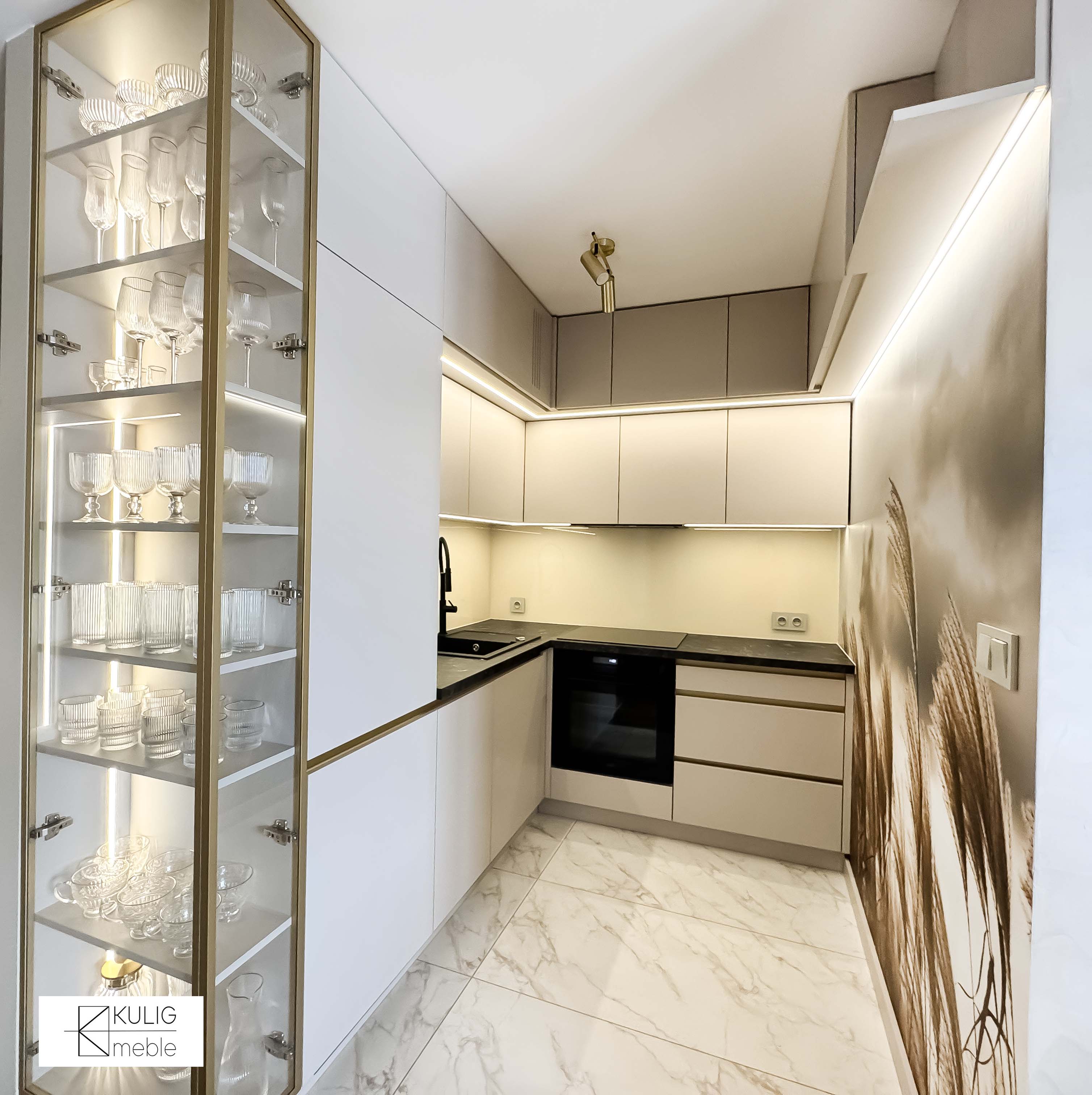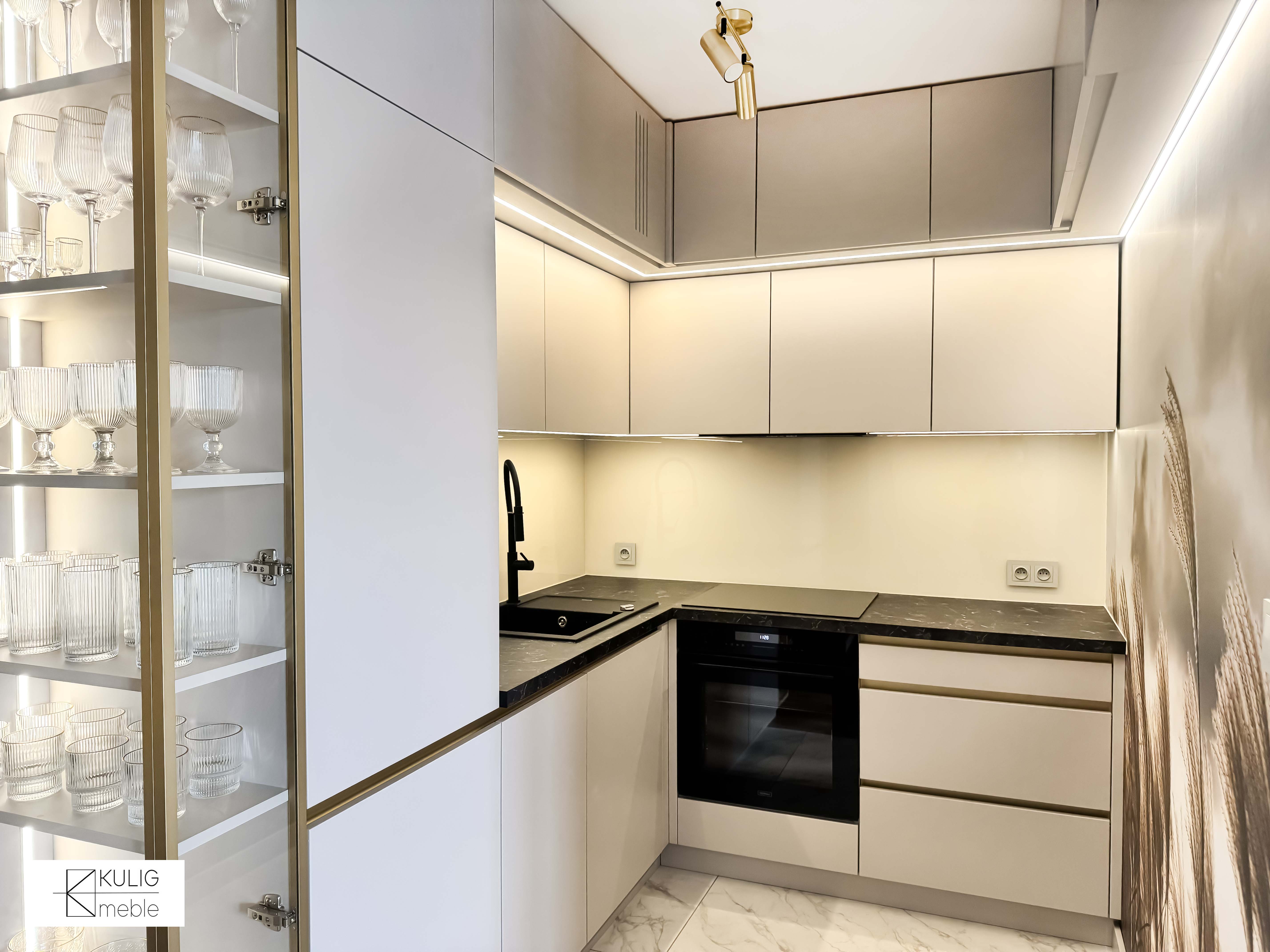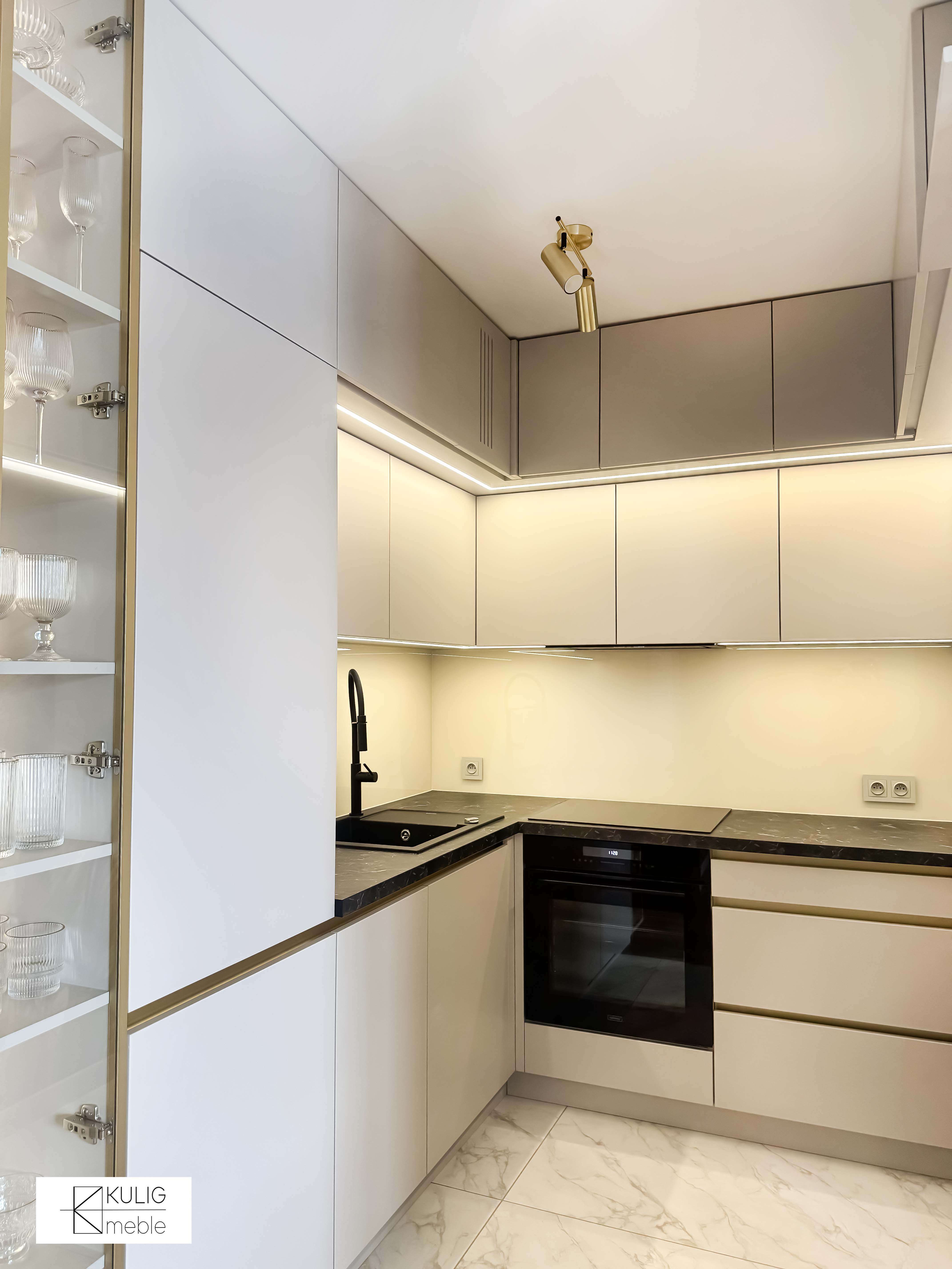 Kuchnia na wymiar K57 marki KULIG meble - Ta realizacja to idealne połączenie minimalizmu, elegancji i funkcjonalności. Kuchnia została zaprojektowana w modnym odcieniu kaszmiru, z subtelnymi złotymi akcentami i przemyślanym oświetleniem LED, które buduje wyjątkowy klimat wnętrza. dla osób, które cenią nowoczesny design, wysoką funkcjonalność i sprawdzone materiały.