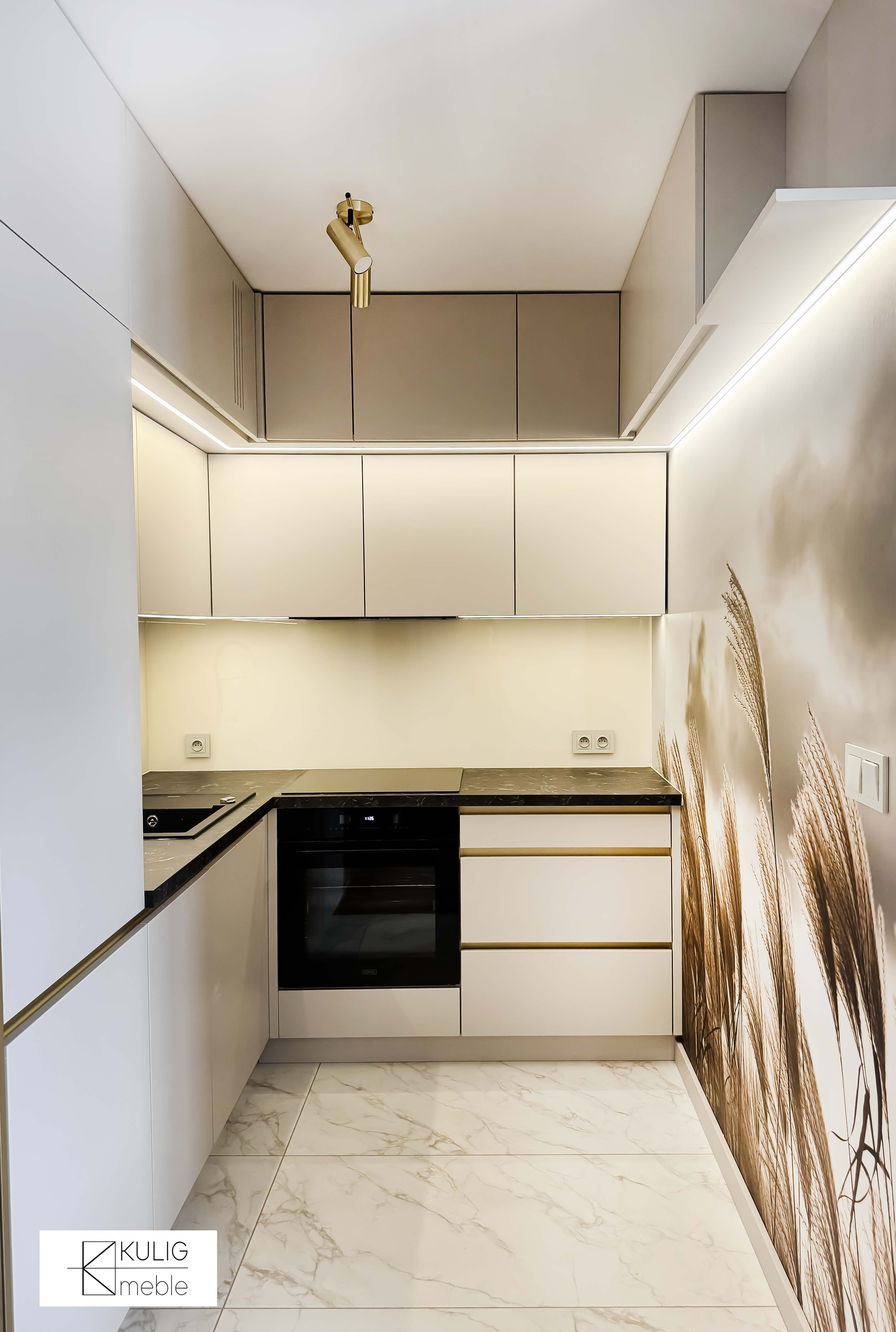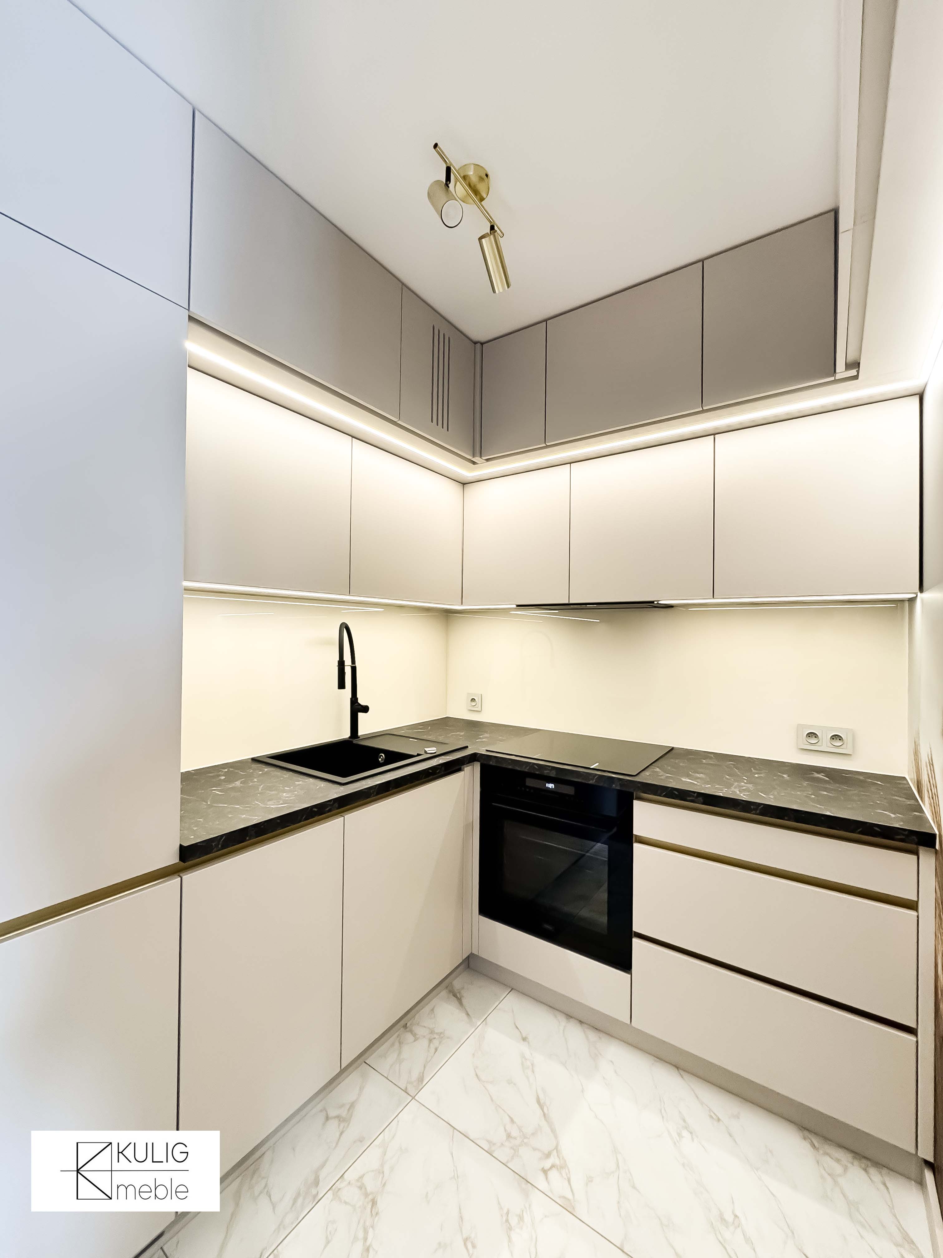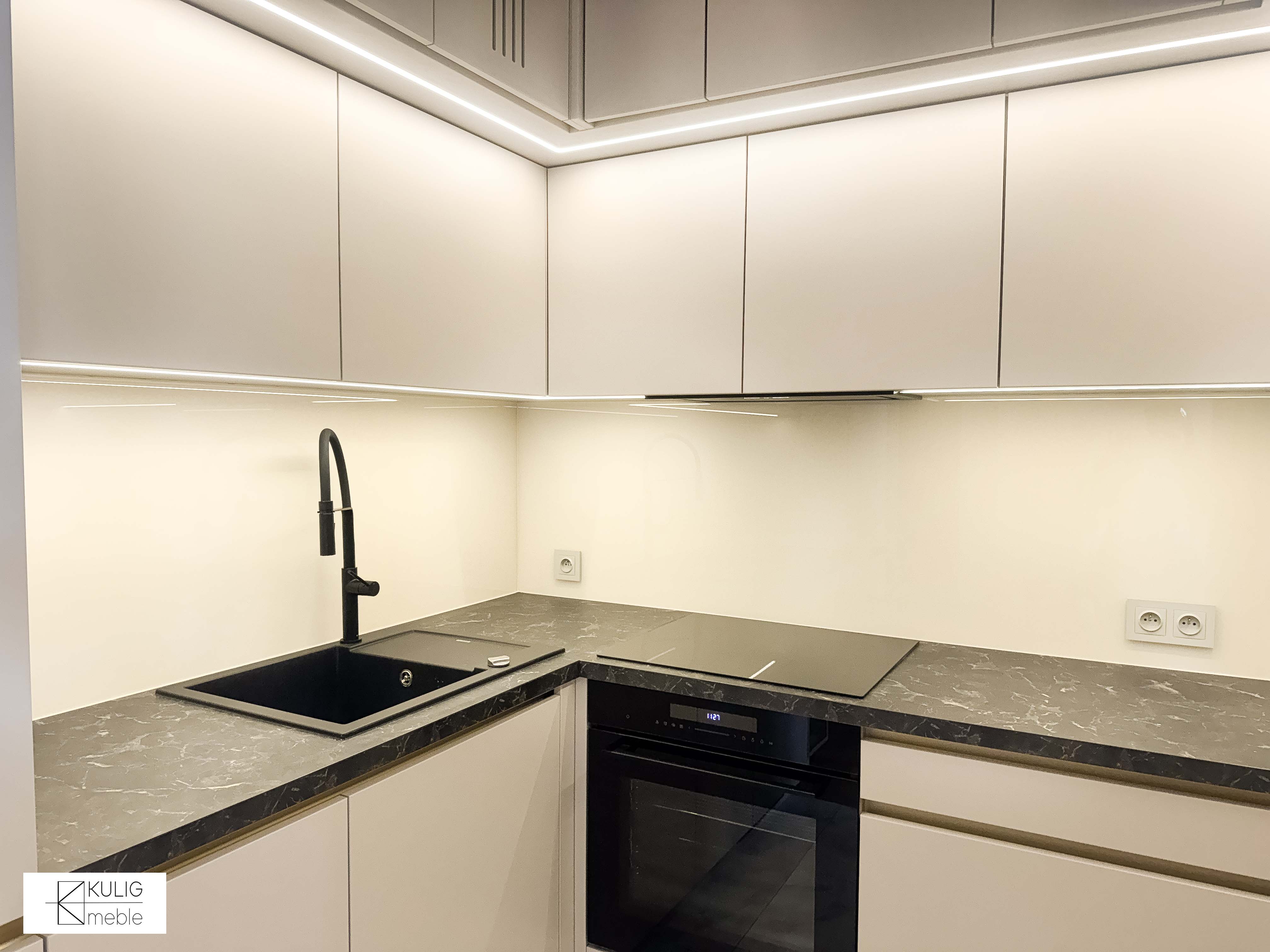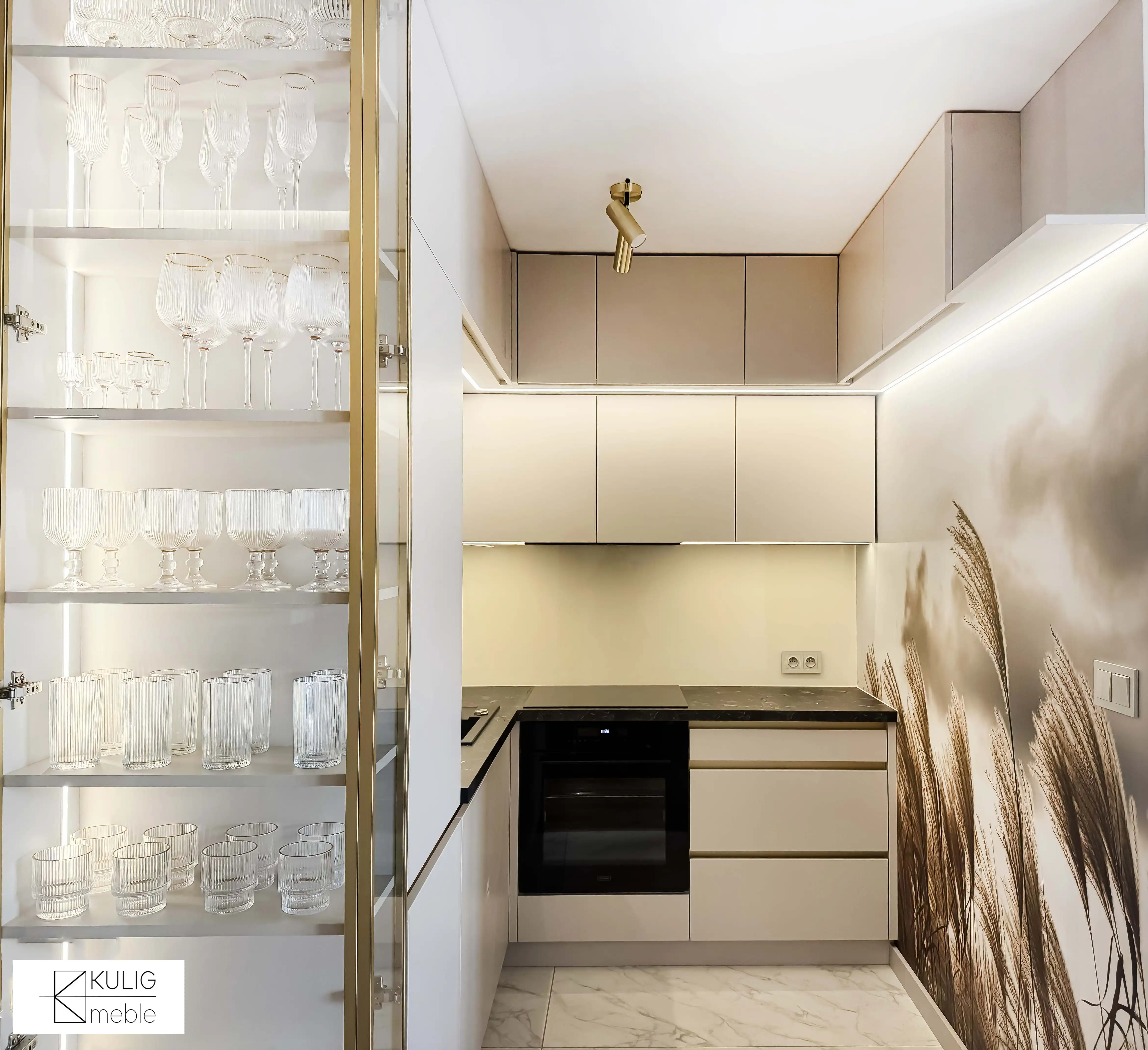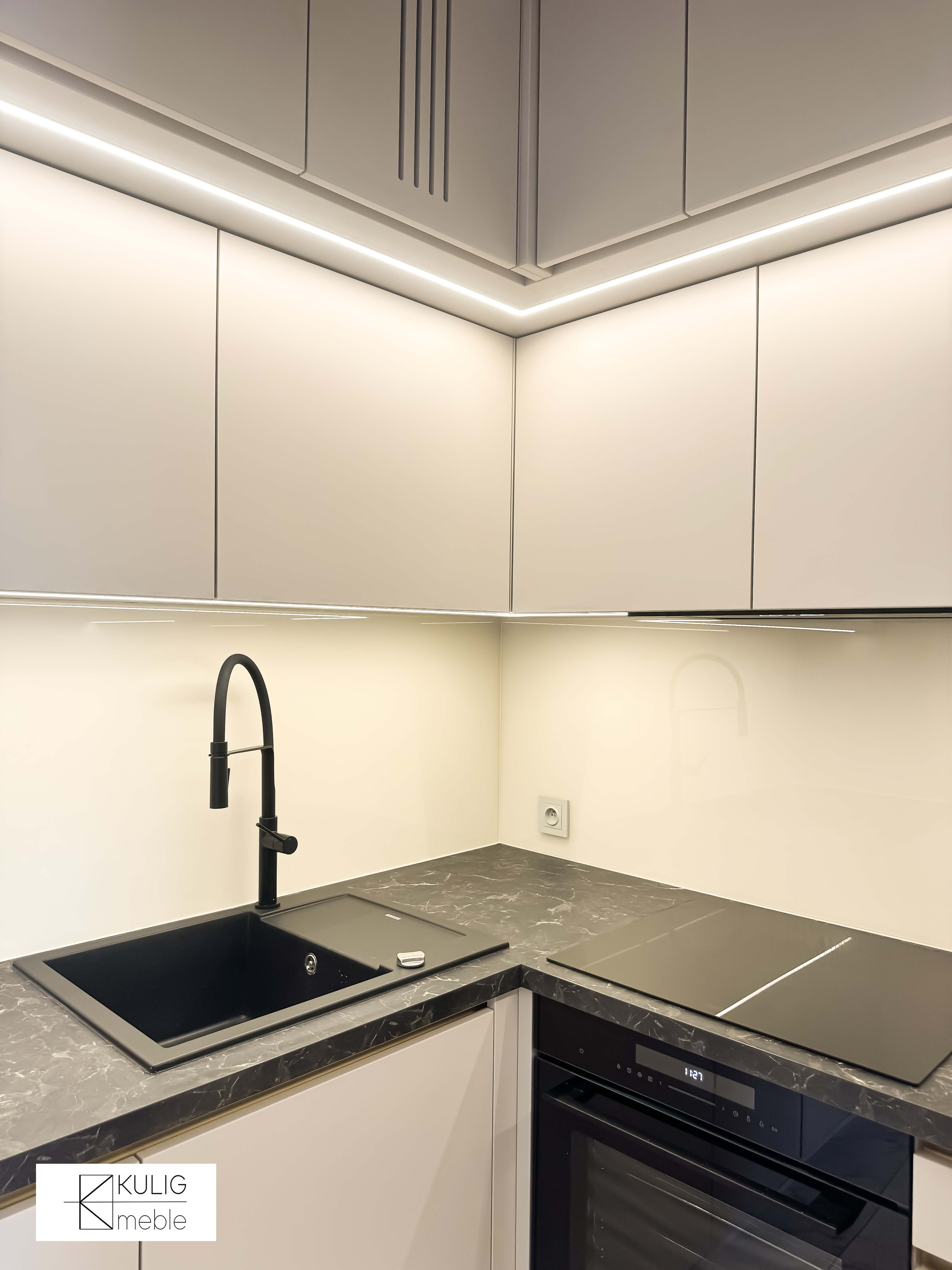 Kuchnia na wymiar K57 marki KULIG meble - Ta realizacja to idealne połączenie minimalizmu, elegancji i funkcjonalności. Kuchnia została zaprojektowana w modnym odcieniu kaszmiru, z subtelnymi złotymi akcentami i przemyślanym oświetleniem LED, które buduje wyjątkowy klimat wnętrza. dla osób, które cenią nowoczesny design, wysoką funkcjonalność i sprawdzone materiały.