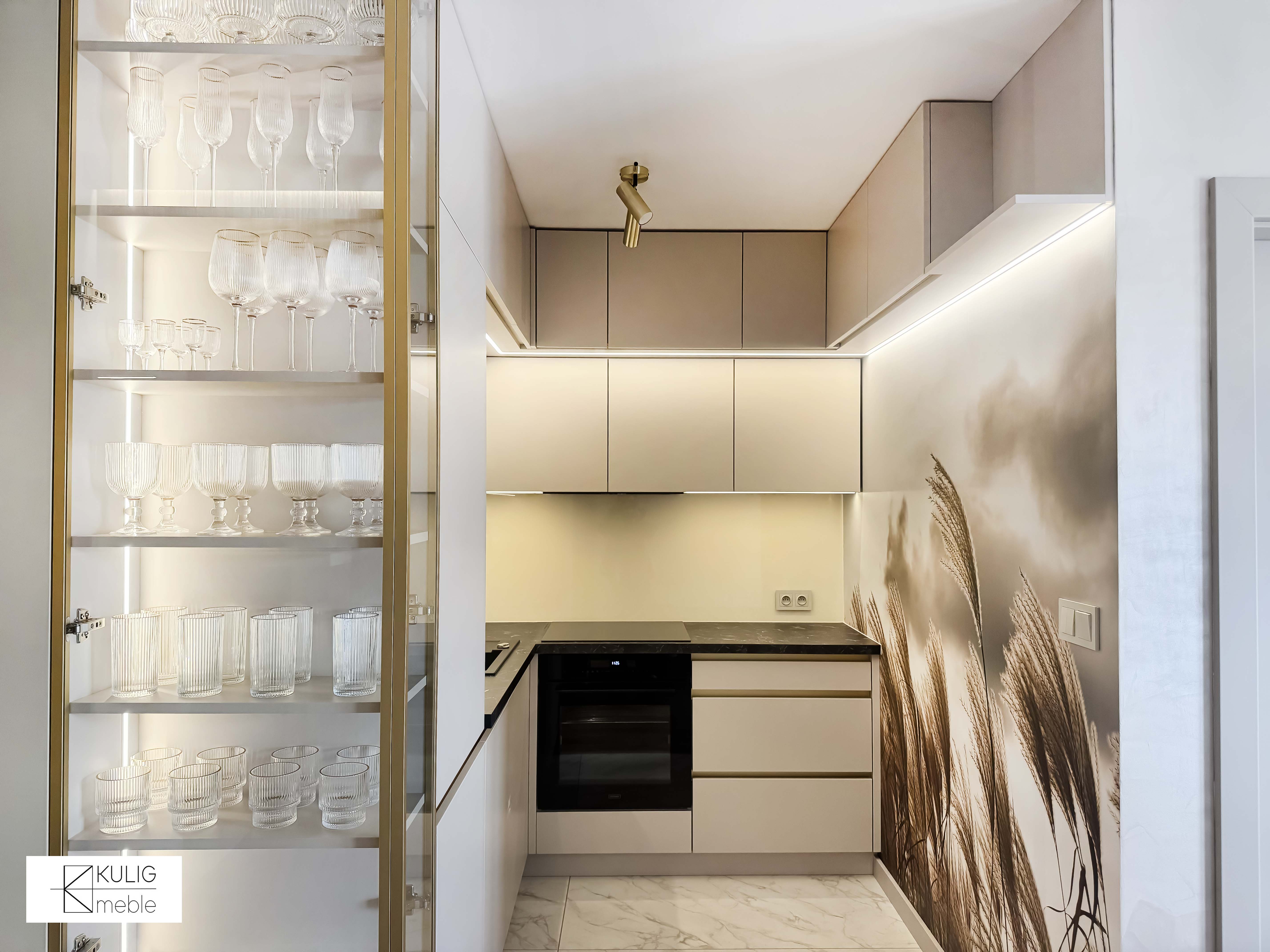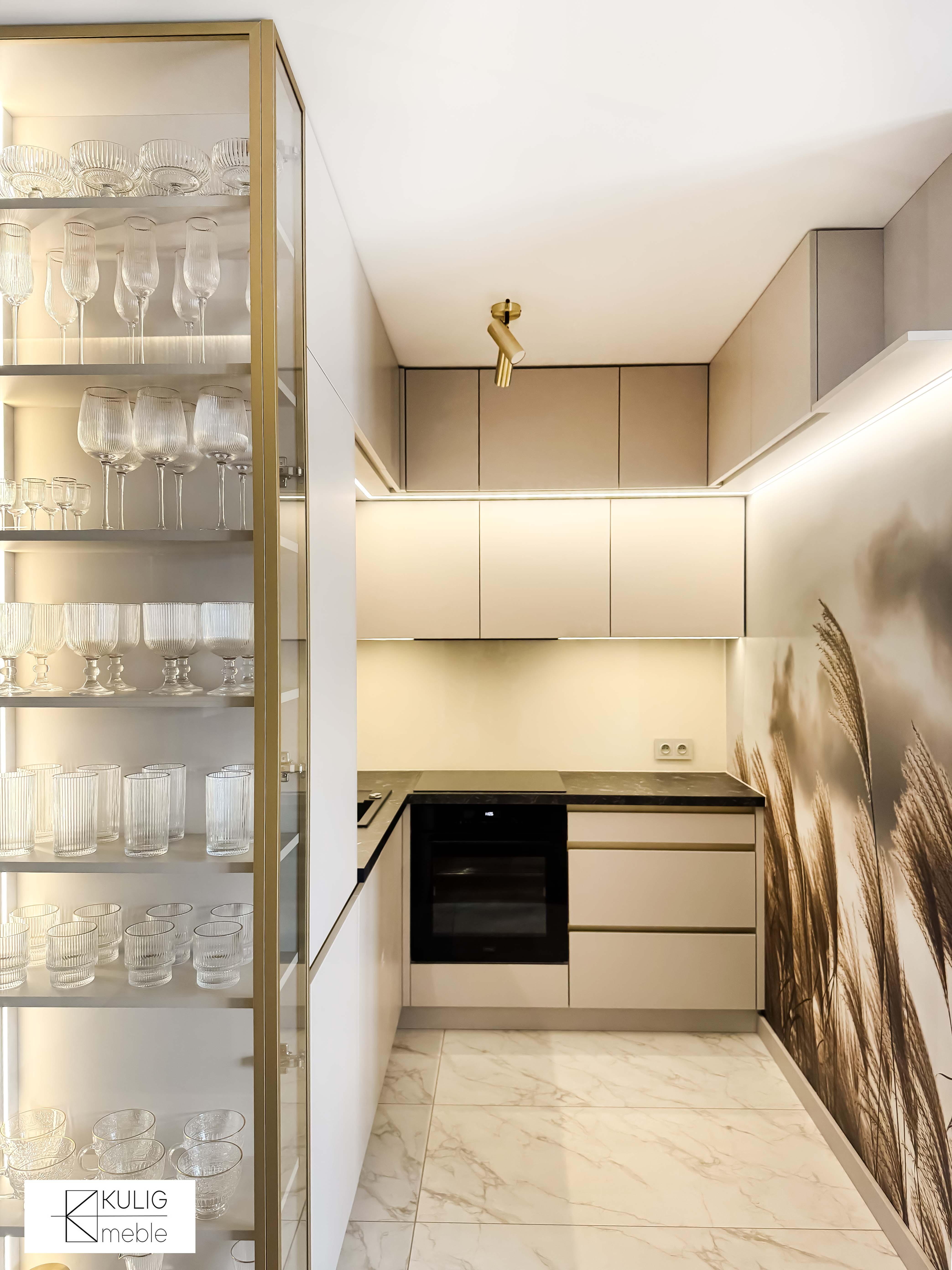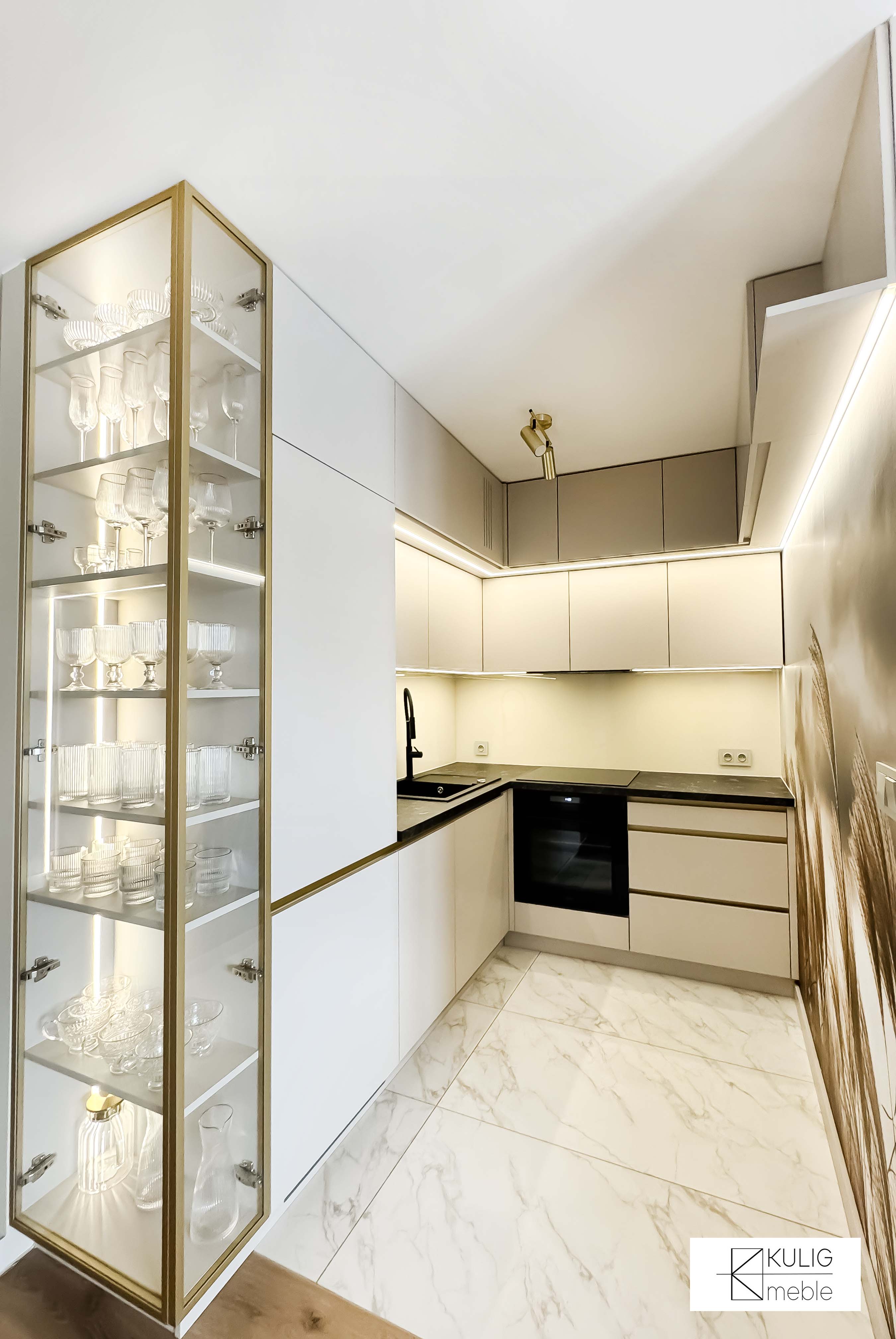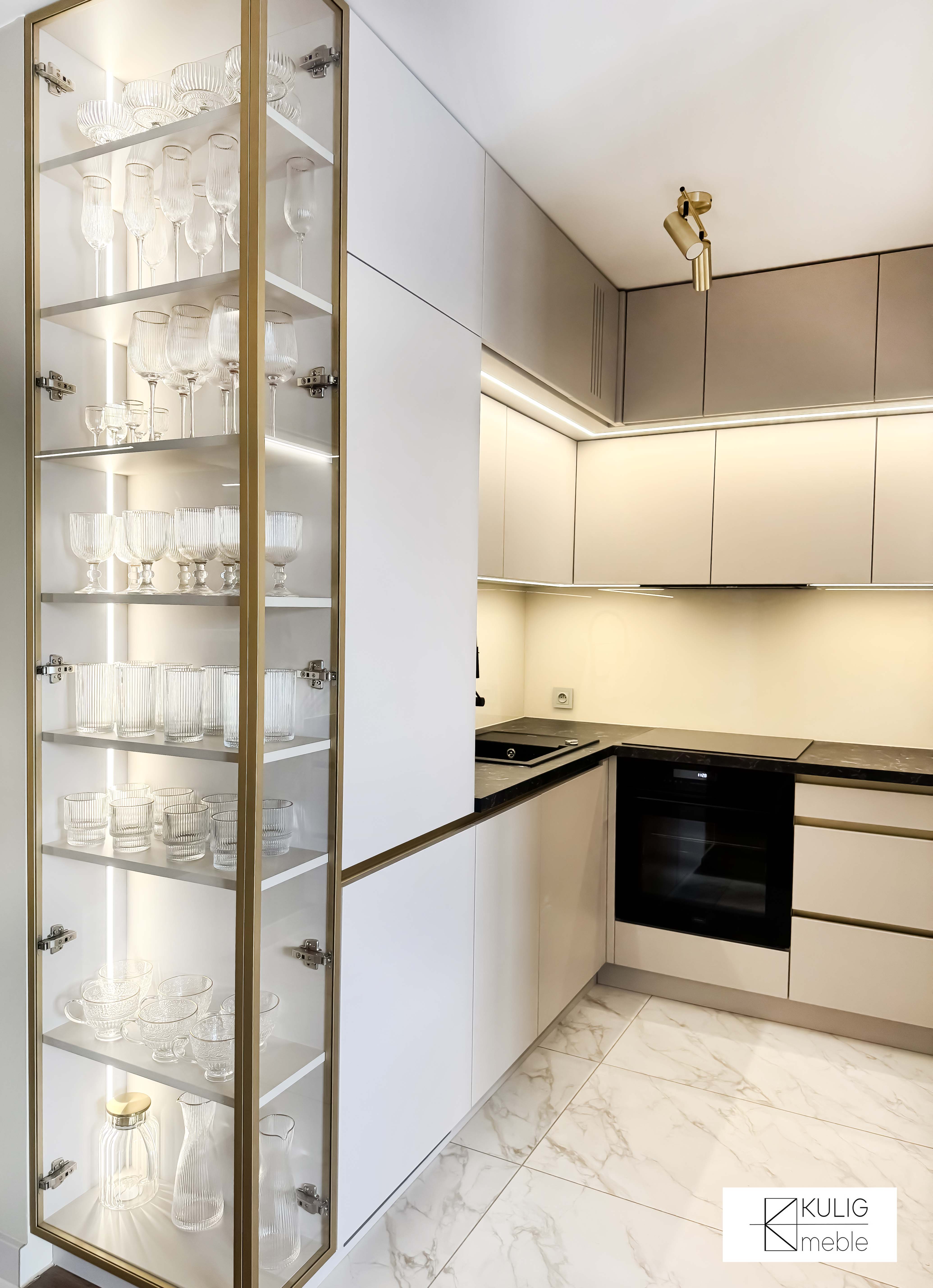Nowoczesna kaszmirowa kuchnia z witryną i złotymi detalami K57