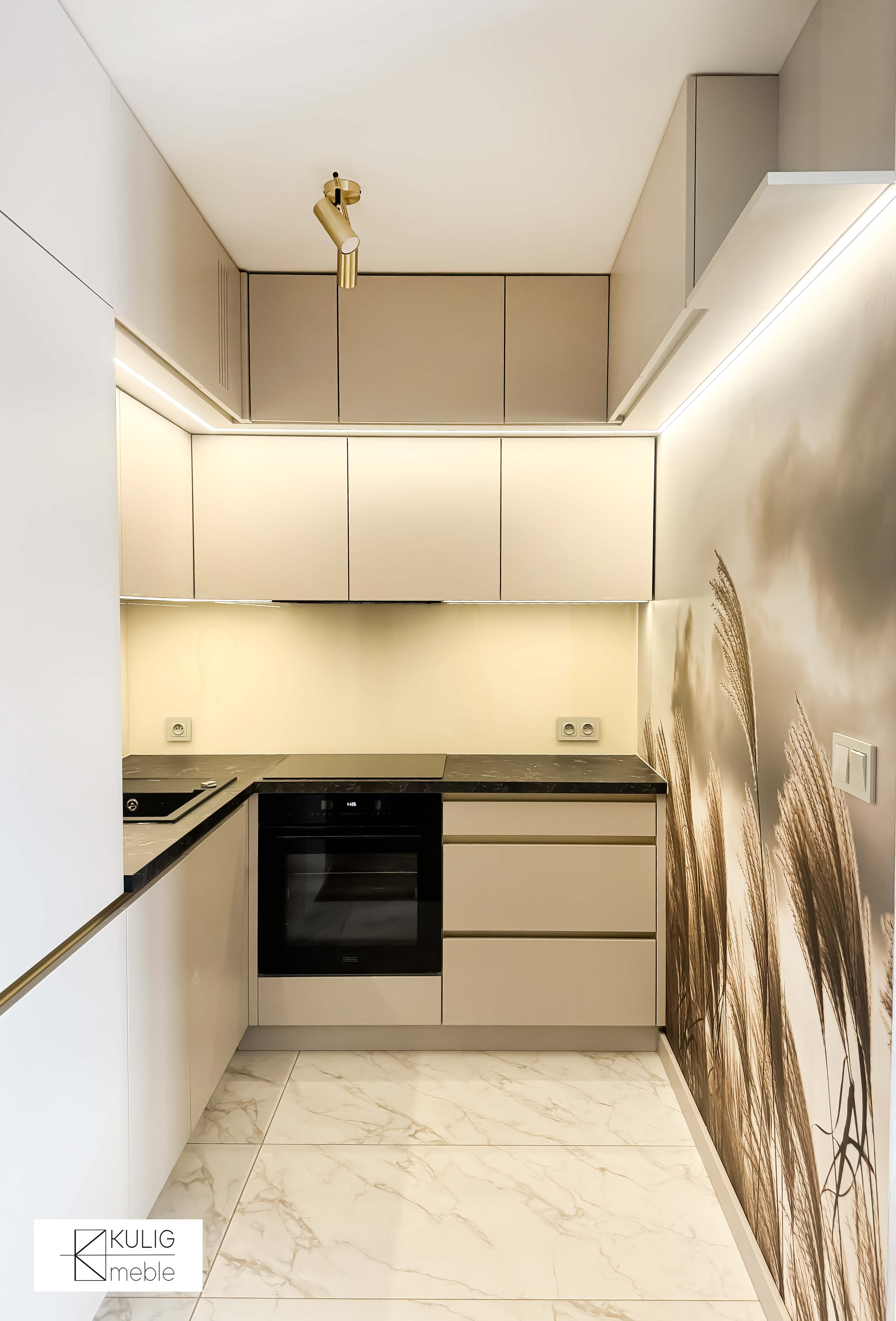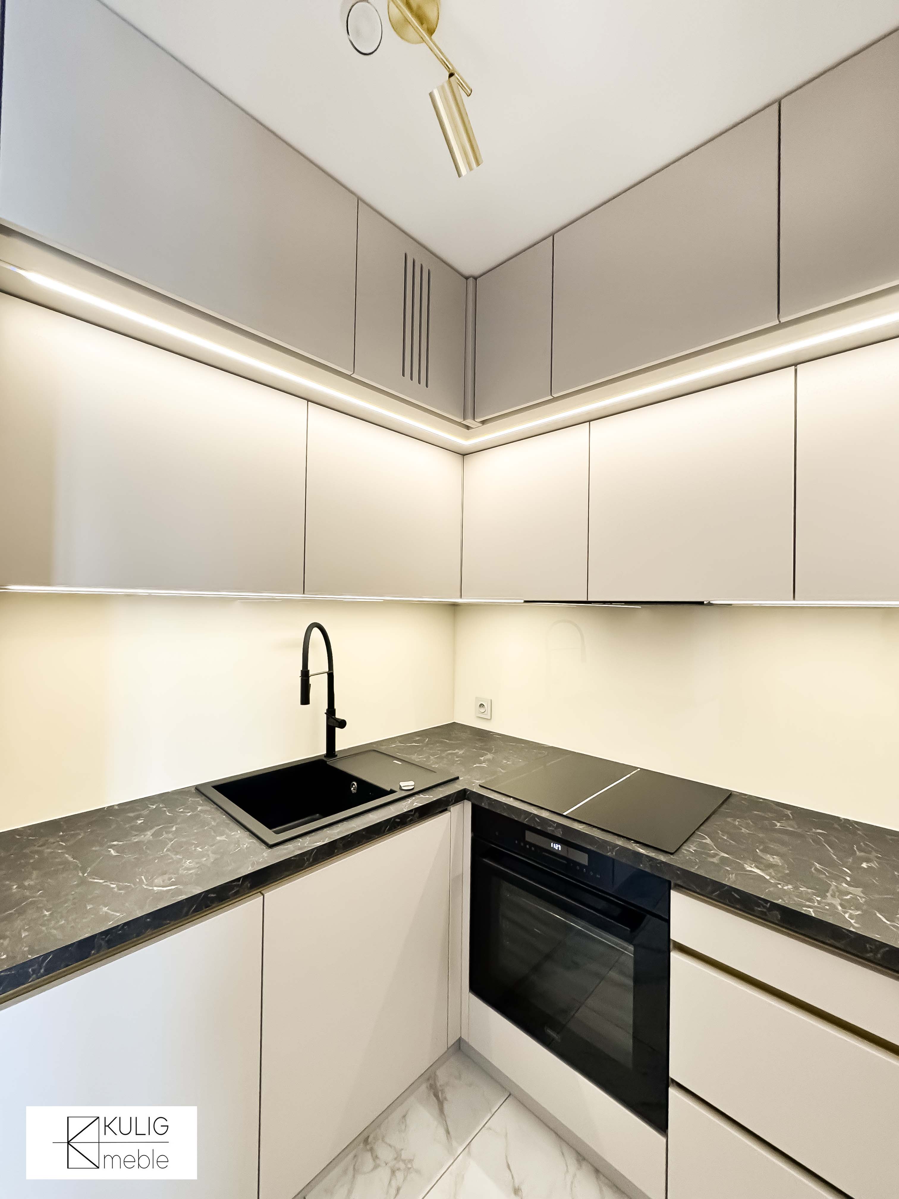 Projekt powstał na indywidualne zamówienie i w pełni wykorzystuje potencjał niewielkiej przestrzeni. Kuchnia została wykonana w układzie narożnym, co pozwoliło na ergonomiczne rozmieszczenie wszystkich stref: gotowania, przechowywania i zmywania. Dzięki zabudowie aż pod sufit uzyskano dużo miejsca do przechowywania bez wizualnego przeciążenia wnętrza. W szafkach zastosowano fronty MDF lakier półmat w kolorze kaszmir (NCS S 2005 Y60R). Całość uzupełnia korpus w dekorze kaszmir (płyta laminowana U6933), dzięki czemu kuchnia wygląda bardzo jednolicie i premium.