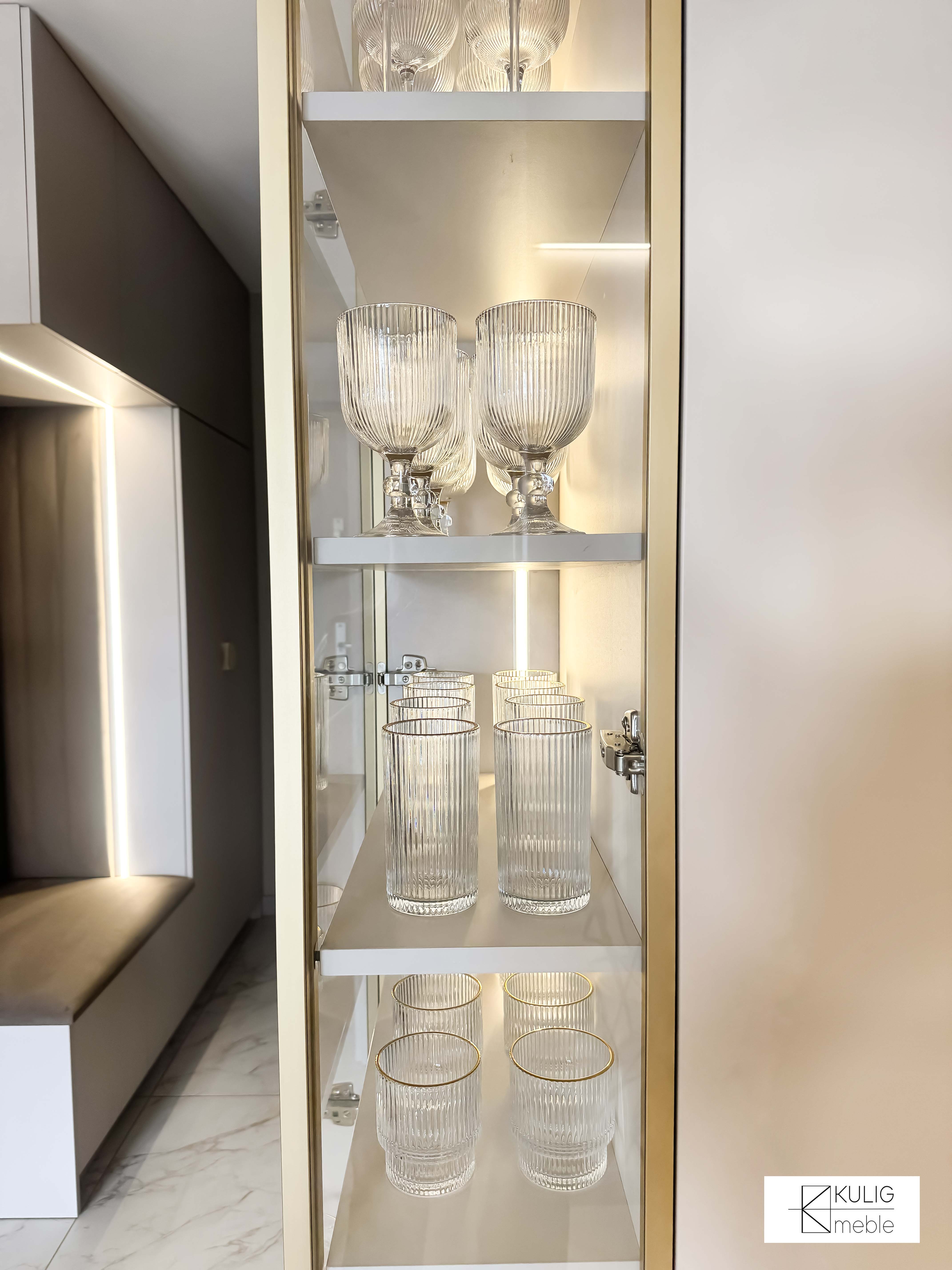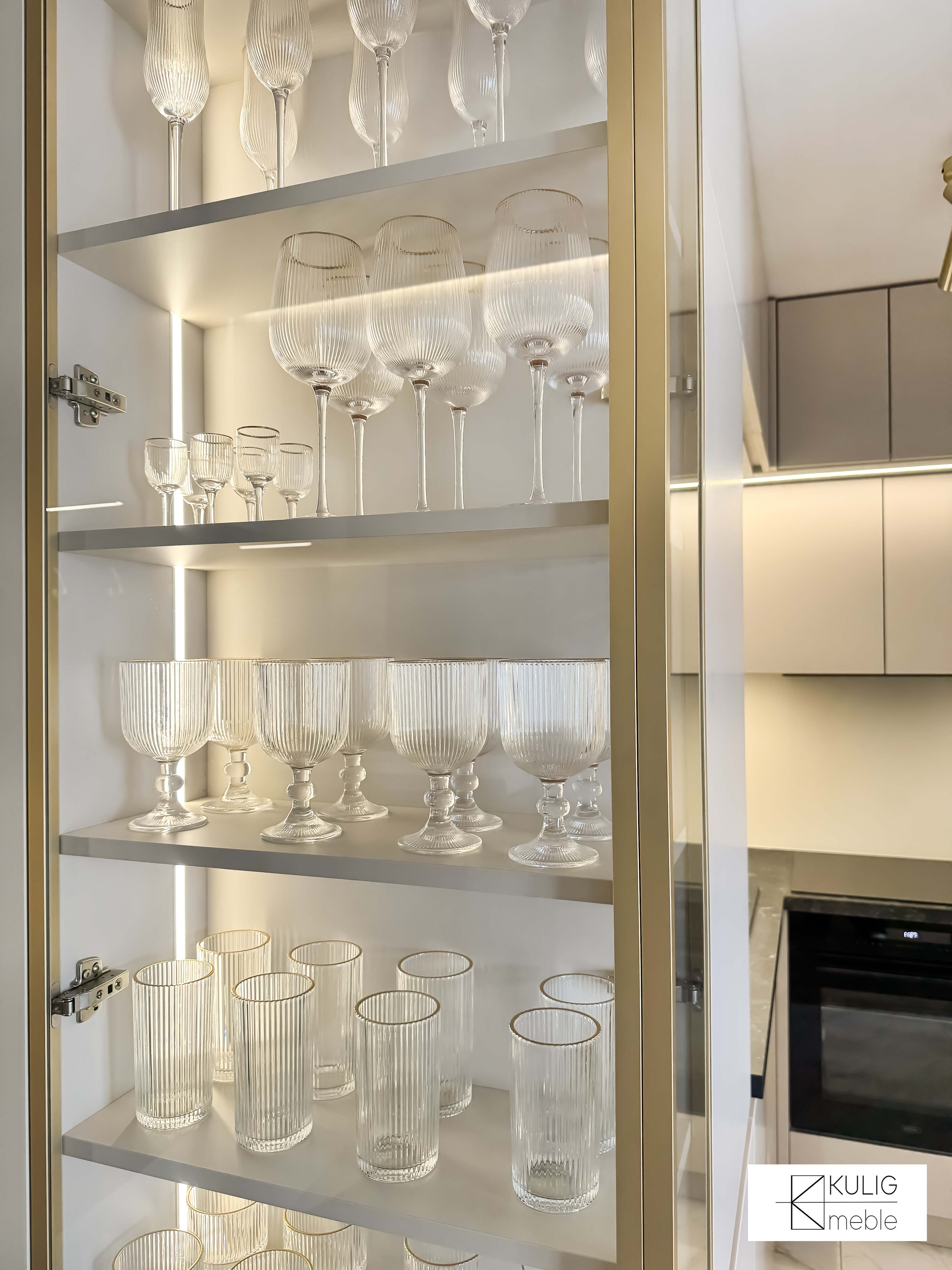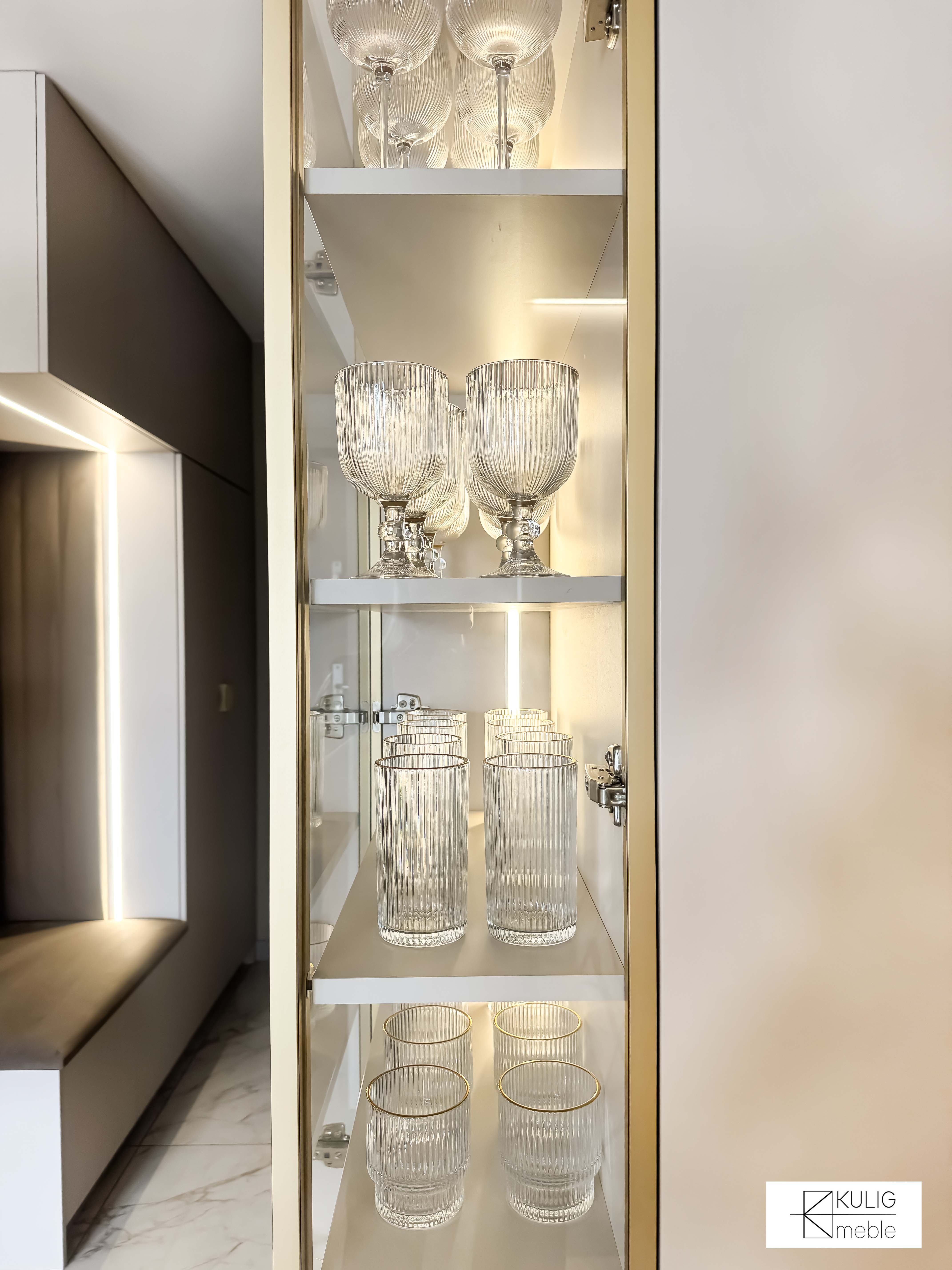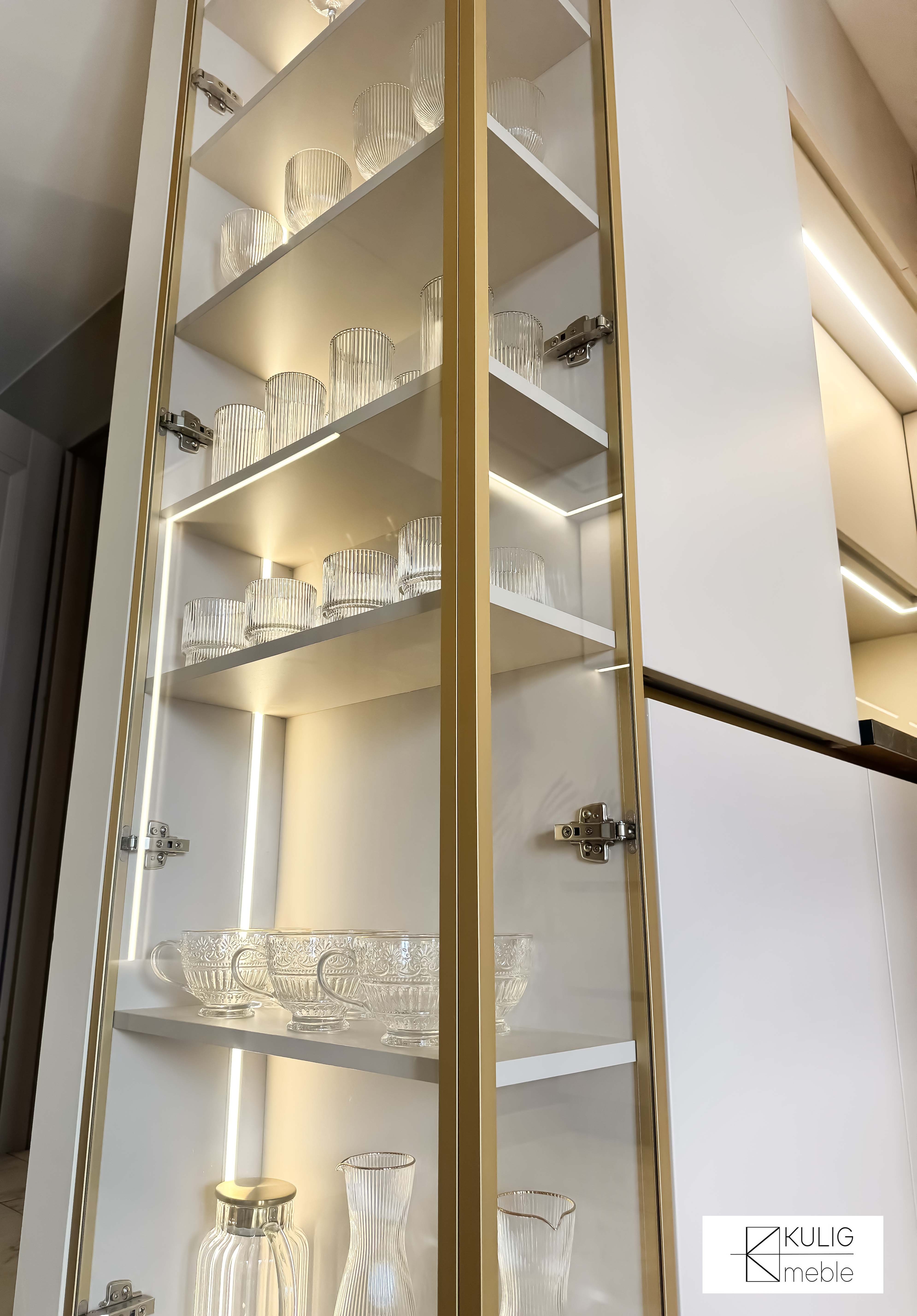 Niewątpliwym wyróżnikiem tej realizacji jest elegancka witryna, która pełni zarówno funkcję praktyczną, jak i dekoracyjną. Zaprojektowana w złotej, matowej ramce ze szkłem transparentnym, wprowadza do wnętrza lekkość i subtelny efekt luksusu. Dzięki podświetleniu LED umieszczonemu w osi tylnej ścianki, eksponowane szkło i dodatki prezentują się wyjątkowo efektownie - szczególnie po zmroku. To rozwiązanie sprawia, że kuchnia przestaje być wyłącznie przestrzenią roboczą, a staje się częścią reprezentacyjną wnętrza.