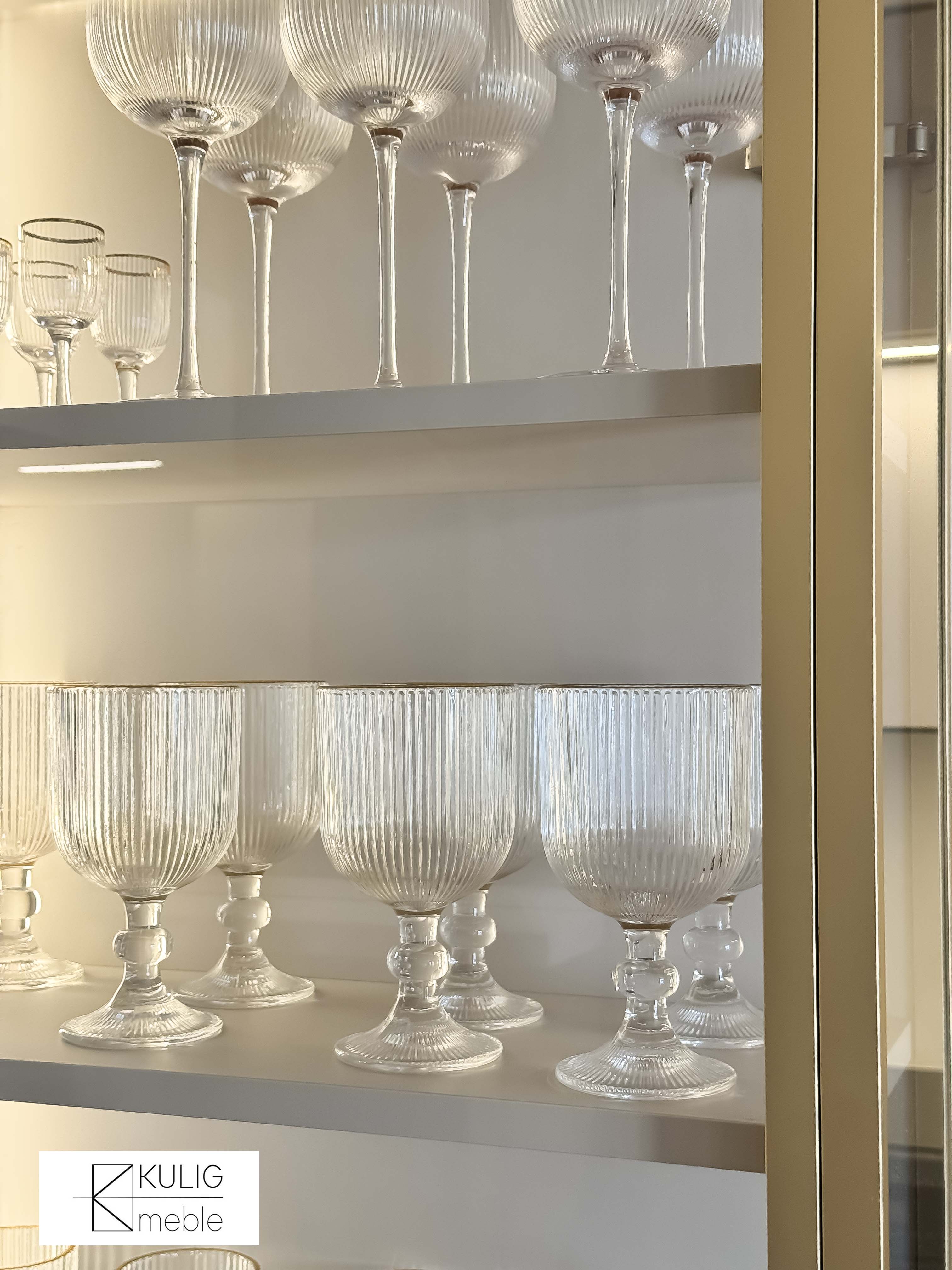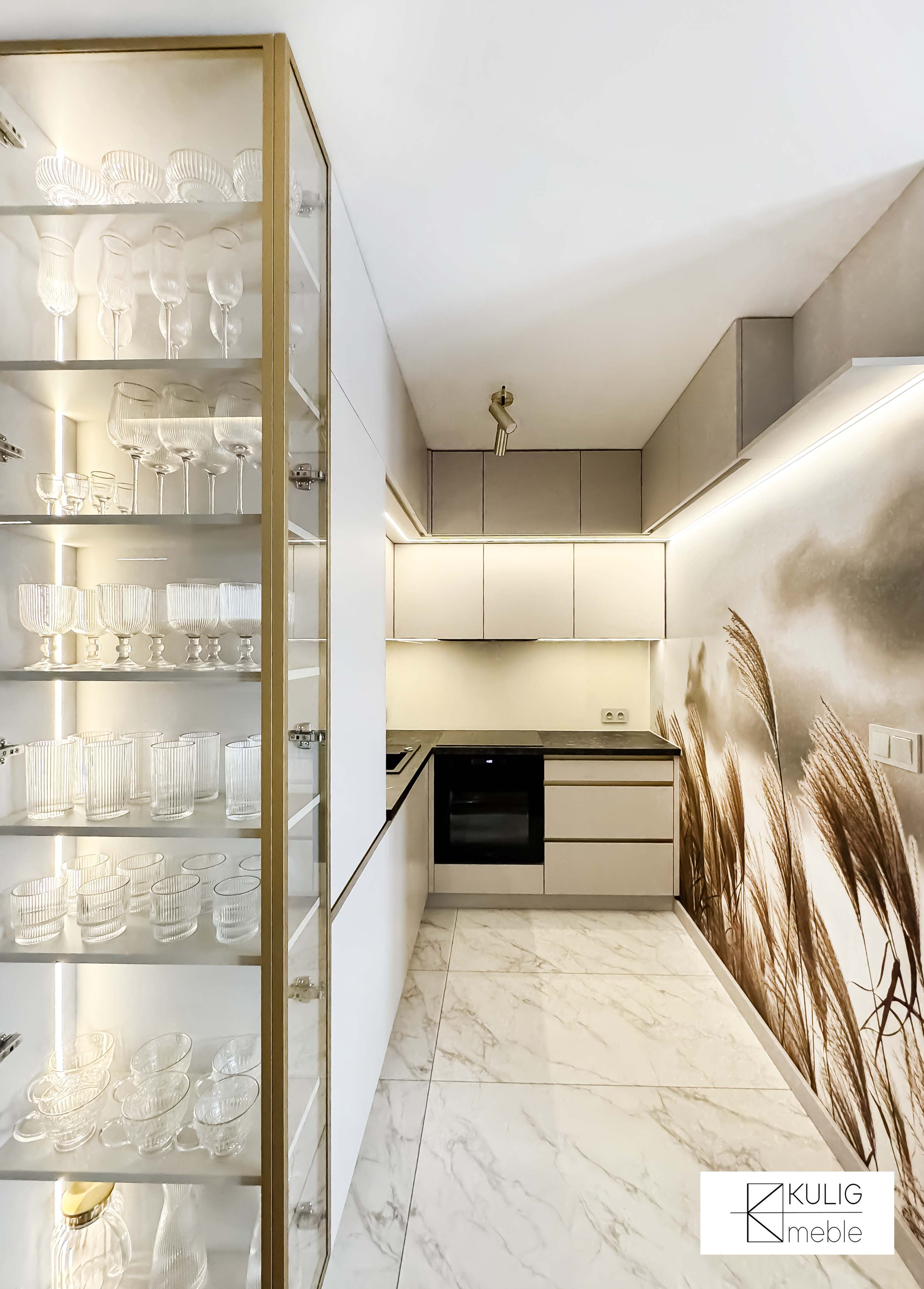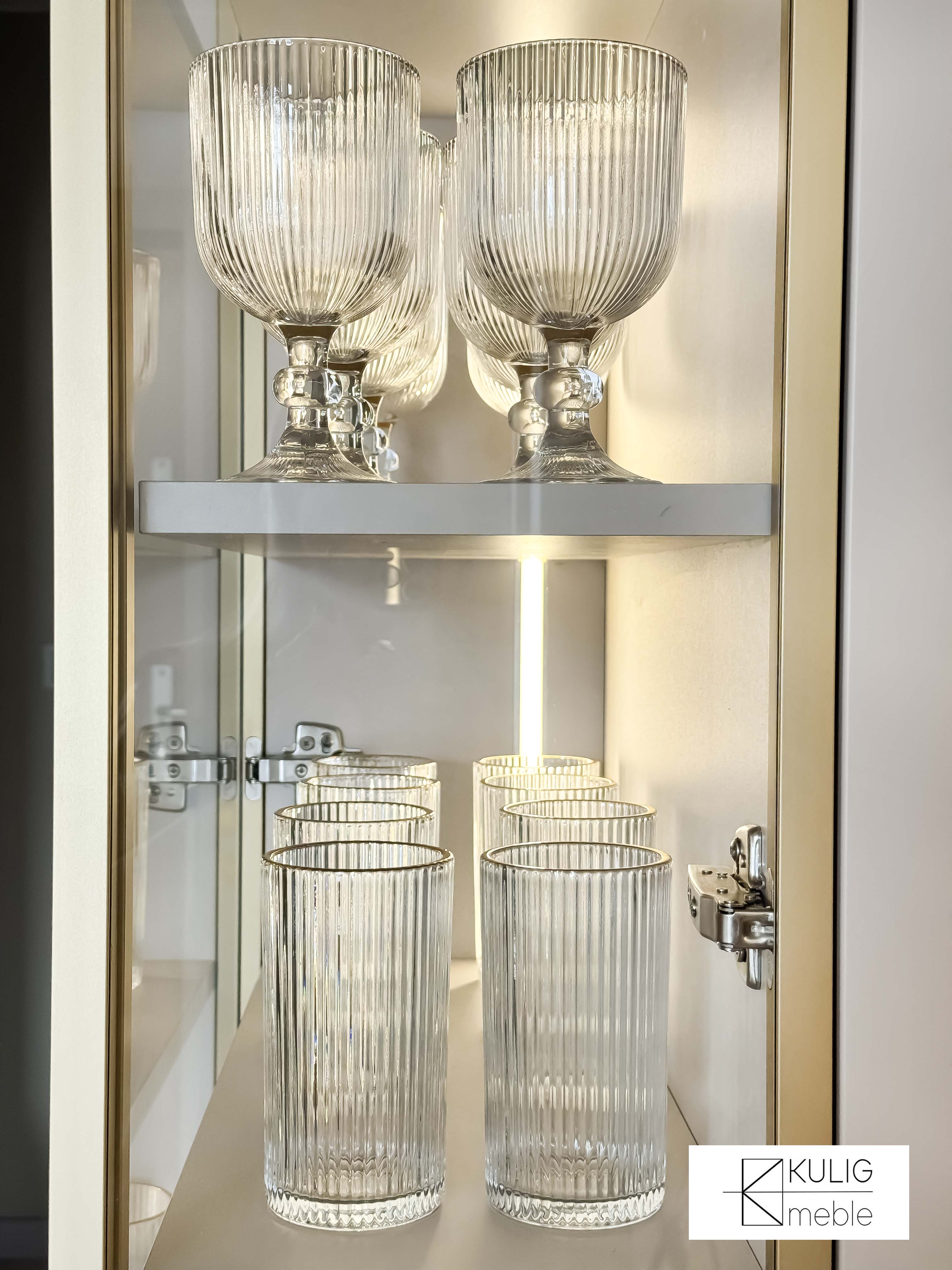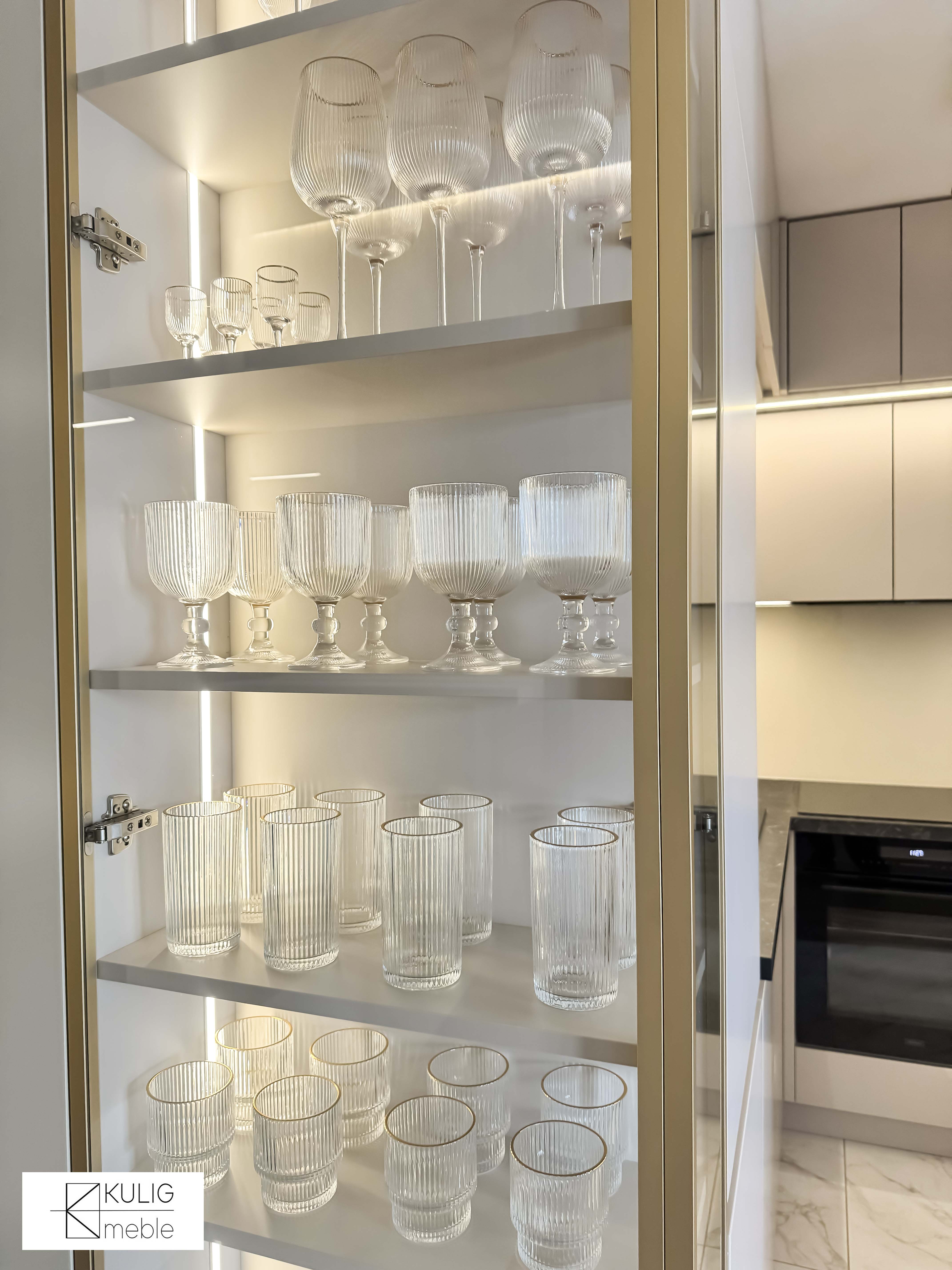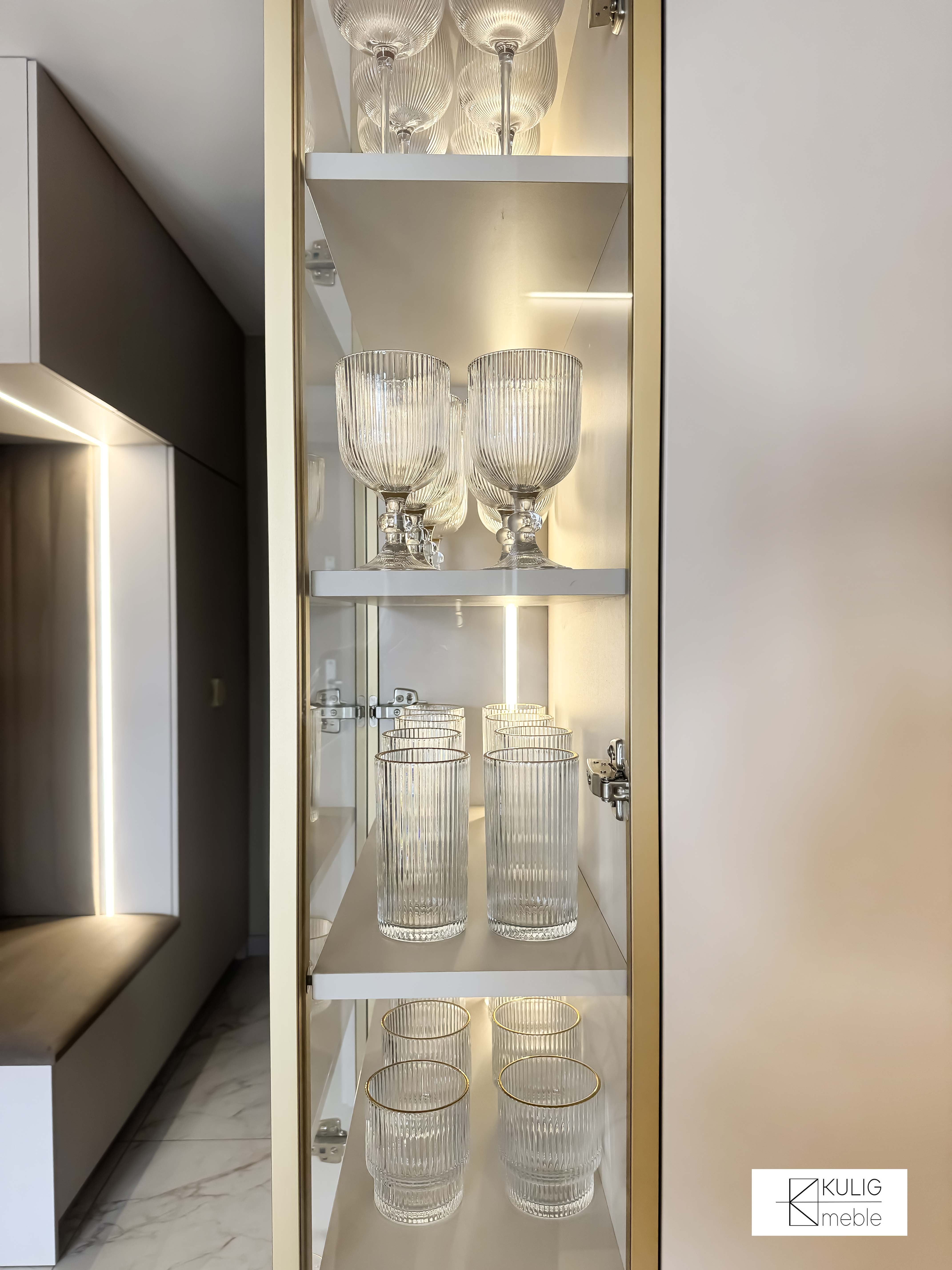 Niewątpliwym wyróżnikiem tej realizacji jest elegancka witryna, która pełni zarówno funkcję praktyczną, jak i dekoracyjną. Zaprojektowana w złotej, matowej ramce ze szkłem transparentnym, wprowadza do wnętrza lekkość i subtelny efekt luksusu. Dzięki podświetleniu LED umieszczonemu w osi tylnej ścianki, eksponowane szkło i dodatki prezentują się wyjątkowo efektownie - szczególnie po zmroku. To rozwiązanie sprawia, że kuchnia przestaje być wyłącznie przestrzenią roboczą, a staje się częścią reprezentacyjną wnętrza.